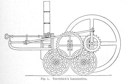 The first locomotive engine designed to run upon rails was constructed in 1803, under the direction of Richard Trevithick, a Cornish mine captain in South Wales. Though crudely and peculiarly made, it possessed all of the characteristics of the modern locomotive with the exception of the multi-tubular boiler. The locomotive had a return-flue boiler 60 inches long, and two pairs of driving wheels - each 52 inches in diameter. Thepower was furnished by one cylinder, 54 inches long and 8 inches in diameter. The exhaust steam from the cylinder was conducted to the smoke-stack where it aided in creating a draft on the fire. This engine, shown in Fig. 1, made several trips of nine miles each, running about five miles per hour and carrying about two tons. Although the machine was a commercial failure, yet from a mechanical standpoint, it was a great success.