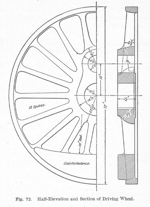The running gear of a locomotive is composed of the following important parts: Wheels, axles, rods, pistons, and the frames which form a connection between these parts.Wheels. The driving wheels have a cast-iron or steel center protected by a steel tire. Until about 1896, cast iron was universally employed for wheel centers and is yet used for the smaller engines. For engines having large cylinders, where a saving of weight is important, cast steel is now used makes possible a considerably lighter construction. Such a wheel is illustrated in Fig. 72. The universal method of fastening on the tire is to bore it out a trifle smaller than the diameter to which the center is turned, then expand it by heating and after slipping it over the center allow it to contract by cooling. The shrinkage commonly used is 1/80 of an inch for each foot diameter of wheel center for all centers of cast iron or cast steel less than 66 inches in diameter. For centers more than 66 inches in diameter, 1/60 of an inch for each foot diameter is allowed for shrinkage. This gives the following shrinkages: