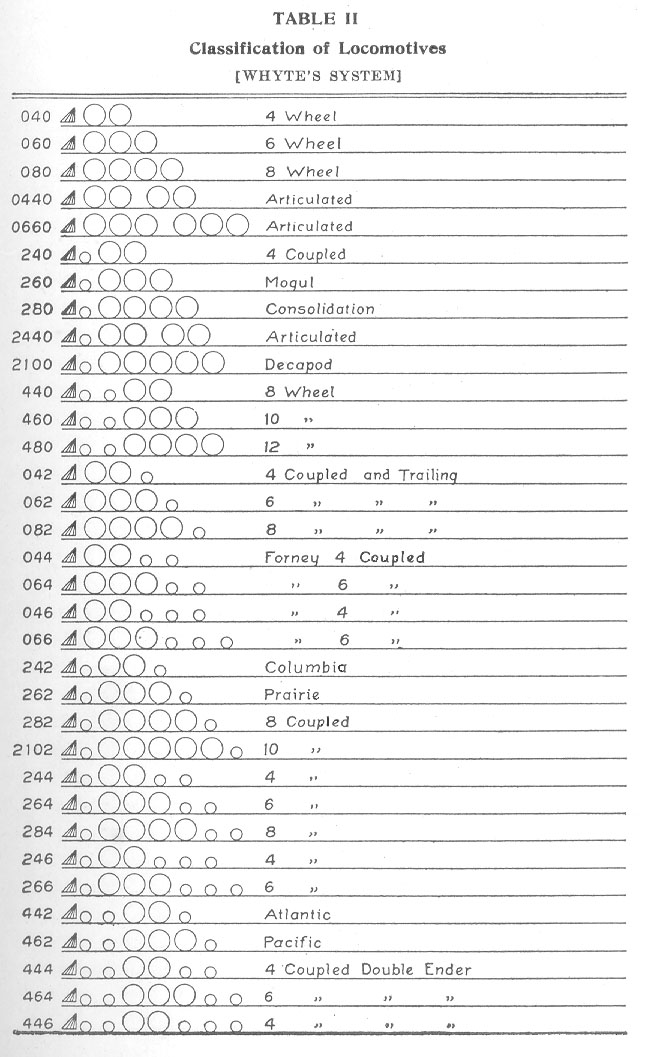 In order that a clear understanding may be had of the various types of locomotives, a classification is given according to wheel arrangement. In the Whyte system of classification, which is quite largely used, each set of trucks and driving wheels is grouped by number beginning at the pilot or front end of the engine. Thus, 260 means a Mogul, and 460, a 10-wheel engine. The first figure, 2, in 260 denotes that a 2-wheeled truck is used in front; the figure 6, that there are six coupled drivers, three on each side; and the 0, that no trailing truck is used. This scheme gives both a convenient and easy method of classifying locomotives.In Table II is given the classification of the locomotives used on American railroads.