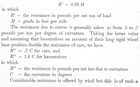 S = speed in miles per hourThe force for starting is, however, about 20 pounds per ton which falls to 5 pounds as soon as a low rate of speed is obtained. The resistance due to grades is expressed by the formula