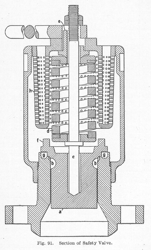 It should be so designed that it can neither be tampered with nor get out of order. It must act promptly and efficiently and not be affected by the motion of the locomotive. These conditions are all fulfilled in the type of valve shown in section in Fig. 91. In this design, the valve a rests on the seat b b and is held down by a spindle c, the lower end of which rests on the bottom of a hole in the valve a. A helical spring d tests on a collar on the spindle. The pressure on the spindle is regulated by screwing the collar e up or down. The valve seat b b may be rounded or straight. Outside of the valve seat there is a projection f, beneath which a groove g is cut in the casing. When the valve lifts, this groove is filled with steam which presses against that portion of the valve outside of the seat, and, by thus increasing the effective area of the valve, causes it to rise higher and to remain open longer than it otherwise would without this projection. The adjustment of the valve is usually made so that after opening, it will permit steam to escape until the pressure in the boiler is about 4 pounds below the normal pressure. The steam escaping through the small holes h, is muffled, thus avoiding great annoyance.
