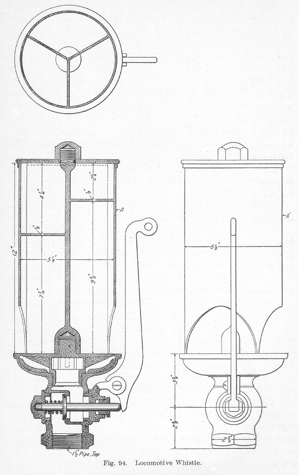 The Whistle. The whistle is used for signaling purposes and consists of a thin circular bell, Fig. 94, closed at the top and sharp at the lower edge. Steam is allowed to escape from a narrow circular orifice directly beneath the edge of the bell. A part of the escaping steam enters the interior of the bell and sets up vibrations therein. The more rapid these vibrations, the higher the tone of the whistle. The tone is affected by the size of the bell and the pressure of the steam. The larger the bell, the lower will be the tone. The higher the steam pressure, the higher the tone. In order to avoid the shrill noise of the common whistle, chime whistles are commonly used, one type of which is illustrated in Fig. 94. In this illustration the bell is divided into three compartments of such proportions that the tones harmonize and give an agreeable chord.Steam Gauges. The usual construction of the steam gauge will not be presented here but reference is made to the instruction paper on "Boiler Accessories."