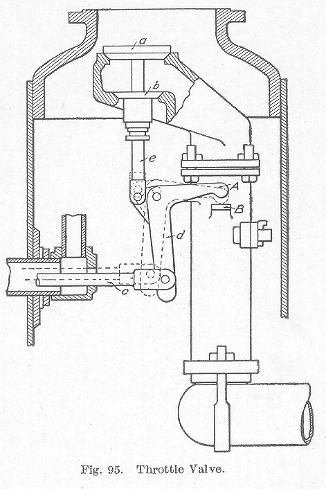 Throttle Valve. The throttle valve now in universal use is some form of a double-seated poppet valve, as illustrated in Fig. 95. In this type, two valves a and b are attached to a single stem, the upper valve being slightly the larger. The lower valve b is of such a diameter that it will just pass through the seat of the valve a. The steam, therefore, exerts a pressure on the lower face of b and the upper face of a. As the area of a is the greater, the resultant tendency is to hold the valve closed. The valve is, therefore, partially balanced. It will be difficult to open large throttle valves such as are now used on locomotives carrying high steam pressures, with the ordinary direct form of leverage. In such cases, it will be necessary to give a strong, quick jerk to the throttle lever before the valve can be moved from its seat. The arrangement of leverage shown in Fig. 95 obviates this difficulty. The rod c connects with a lever in the cab and coauxuliucates its movement to the bell crank d, whence it is carried by the stem e to the valve. The pivot of the bell crank is provided with a slotted hole. At the start, the length of the short arm is about 2¼ inches while the long arm is about 9½ inches. After the valve has been lifted from its seat and is free from excess pressure on a, the projecting arm A on the back of the bell crank comes in contact with the bracket B on the side of the throttle pipe and the bell crank takes the position shown by the dotted lines in the figure. The end of the projecting arm A then becomes the pivot and the length of the short arm of the lever is changed to 9½ inches and that of the long arm to about 11½ inches.