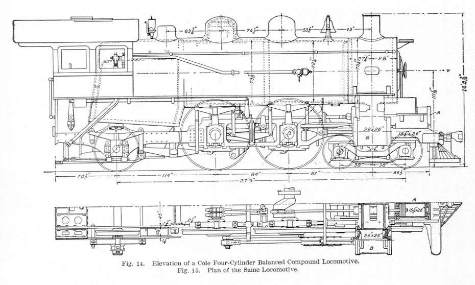 Compound Locomotive. In continuation of a study of the development of the various types of locomotives, it is important to consider the compound locomotive. The compound locomotive is one in which the steam is admitted to one cylinder, called the high-pressure cylinder, where it partially expands. From this cylinder the steam is exhausted into the steam chest of another cylinder having larger dimensions, called the low-pressure cylinder. From this steam chest, the steam enters the low-pressure cylinder where it continues its work and is exhausted into the atmosphere. There have been a large number of different types of compound locomotives developed, all of which have had more or less merit. The following types have been used in America: the four-cylinder balance compound, the Mallet compound, and the tandem compound. The remarks and description which follow, of the Cole four-cylinder compound, are quoted from publications of the American Locomotive Company, builders of this locomotive:The time has arrived when merely increasing weight and size of locomotives to meet increasing weights of trains and severity of service does not suffice. To increase capacity, improve economy, and at the same time reduce injury to track, a new development is needed. Limits of size and weights have been reached in Europe and to meet analogous conditions there, the four- cylinder balanced compound has been developed into remarkably successful practice. The purpose of the Cole four-cylinder balanced compound is to advance American practice by adapting to our conditions the principles which have brought such advantageous results abroad, especially the principles of the de Glehn compound.