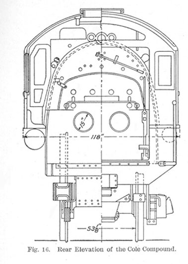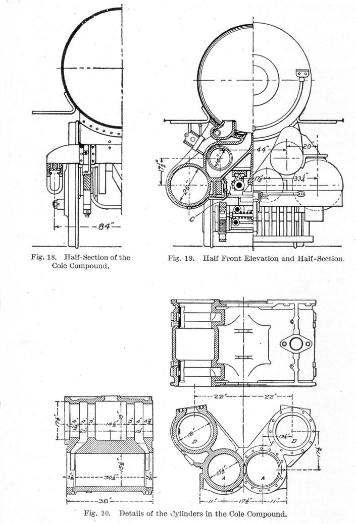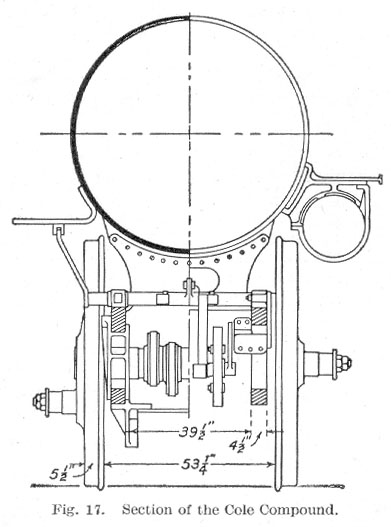 The Cole four-cylinder balanced compound employs the principle of subdivided power to the cylinders; the high pressure (between the frames) drives the forward or crank axle and the others; the low pressure (outside of the frames) drives the second driving axle. In order to secure a good length for connecting rods without lengthening the boiler, the high-pressure cylinders are located in advance of their usual position.