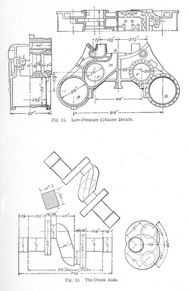 Fig. 22, the crank axle, shows that under the existing conditions it is possible to make this part exceedingly strong. Inasmuch as the cranks on this axle are 90 degrees from one another, it is possible to introduce exceedingly strong 10 by 12½ inch rectangular sections connecting the two crank pins. The whole forms an exceedingly strong and durable arrangement constructed in accordance with the best European practice which is likely both to wear and stand up well in service. A cross-section of the central portion of the axle indicates its proportions between the crank pins.