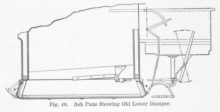 Ash Pans. Ash pans are suspended beneath the fire-box for the purpose of catching and carrying the ashes and coal that may drop between the grate bars. They are made of sheet steel. Fig. 49 illustrates a longitudinal section of an ash pan commonly used in fire-boxes placed between the axles of the engine. It is provided at each end with a damper a hinged at the top and which may be opened and set in any desired position in order to regulate the flow of air to the fire. It is quite important that the dampers should be in good condition in order that the admission of air to the file may be regulated. The total unobstructed air openings in the ash pan need not exceed the total tube area but should not be less than 75 per cent. For many years the type shown in Fig. 49 was almost universally used. More recently, however, a damper capable of better adjustment and more easily kept in condition has been developed. Such a damper is illustrated in Fig. 50. In this type the dampers are placed upon the front faces of the ash pan and are raised and lowered by the contraction of levers and bell cranks. For example, the lifting of the bar a turns the bell crank d which pulls the connection c c which operates the forward bell crank and opens the front damper. In a similar manner, the rear damper i may be operated. If these dampers were made of cast iron and work in guides, it is possible to have the construction such that when closed they will be practically air tight.