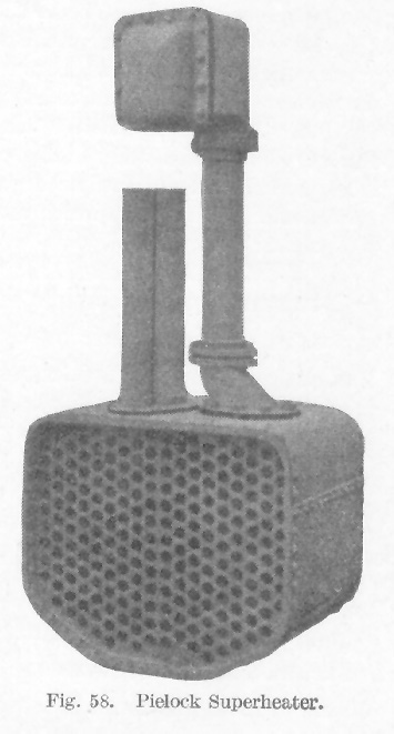 Superheaters. When steam is admitted to the cylinder it meets the cylinder walls, the temperature of which is less than that of the entering steam, and there results an interchange of heat. The fact that the steam gives up a part of its heat to the cylinder, causes some of the steam to condense. As the piston proceeds on its stroke and expansion occurs, some of the steam initially condensed will be re-evaporated. The cylinder, therefore, goes through a process of alternately cooling and reheating, resulting in condensation and re-evaporation; this is the principal loss occurring in the process.In order to assist in reducing this loss to a minimum, superheated steam is being used on locomotives, to a certain limited extent in the United States, by the addition of a superheater. A superheater consists of a series of tubes and headers usually placed in the smoke-box, through which steam passes on its way to the cylinders, thus raising its temperature. It has now secured a certain amount of heat energy from the waste gases which pass out of the stack, thus improving the economy of the locomotive.
