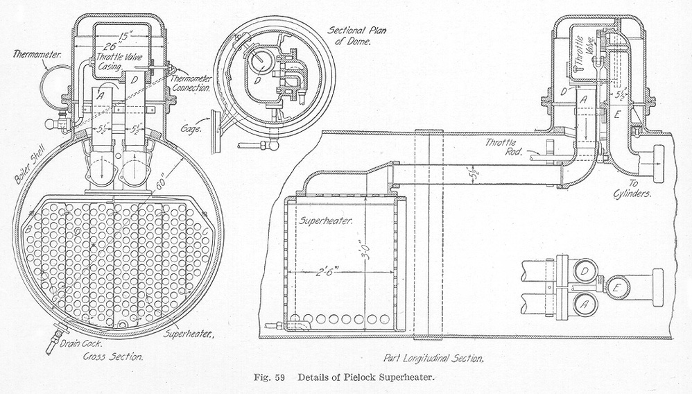 As can be seen from Fig. 60, steam from the dry pipe enters the forward compartments of each of the header castings, passes back through each of the inner tubes, thence forward through the annular space between the inner and middle tubes, through the rear compartments of each of the header castings, and thence into the lower compartment of the T-pipe, thence by the right and left steam pipe D and E to the cylinders. The steam in passing through the different channels is superheated by the smoke-box gases and products of combustion. In this particular design, fifty-five 3-inch tubes are employed, thus displacing as many of the regular smaller tubes as would occupy a similar space.
