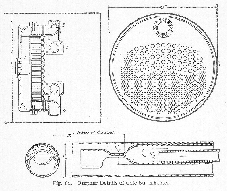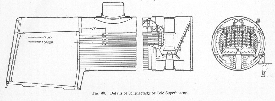 Schenectady or Cole Superheater. The Schenectady superheater was developed by the American Locomotive Company. It has had a large application in recent years and good results are being obtained. The general arrangement and construction of this superheater is shown in Fig. 60 and Fig. 61.