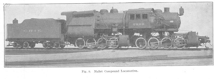 The American type locomotive, illustrated in Fig. 7, is typical of the small sized engines of this construction which are now being rapidly replaced by other types. For a period of nearly fifty years ending about 1895, the American type locomotive was more commonly used for passenger service than any other type.A comparison of things with reference to size, weight, and color impresses their relative characteristics upon the mind. For this reason, the illustrations of the Tornado and the Mallet compound locomotives are given in Fig. 8 and Fig. 9, respectively, the former being an early development, and the latter the most recent heavy freight locomotive.