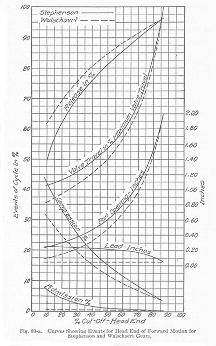 The conditions for both the head end and crank end of the forward motion, in both Stephenson and Walschaert gears are represented in Figs. 69-a and 69-b. Each event of the cycle-valve travel, port opening, and lead-is plotted with reference to the cut-off. As can be seen, the Walschaert gear gives for all cut-off positions a later admission, later release, later compression, less lead, less port opening, and less valve travel than does the Stephenson gear. With the exception perhaps of lead, the differences are negligibly small for all cut-off positions beyond 50 per cent. With cut-off positions less than 50 per cent, however, these differences increase quite rapidly.