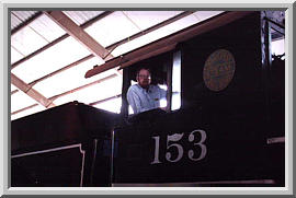 On the back of the tender is a 55 gallon drum of kerosene. I climb up and open the valve at the drum, and climb back down into the cab. I unchain the kerosene burner from the brakestand, and set it up, pointed into the firebox. I connect a hose to the kerosene line coming down off the tender, and another hose to an air compressor outside the building. I take a softball-sized piece of waste, and soak in in kerosene for a minute. Placing it on a shelf of firebrick just inside the firedoor, I whip out a book of matches and light them (yes, the whole book). I then light the waste, and let it get started burning, plug in the burner, and start it up. After a little finagling with the fuel/air mixture, I get a fine mist of kerosene and air that ignites with a WHOOMP! sound. It's 5:30 AM. The burner is now beginning to warm up the engine, and I can take a break. Time for my coffee and rolls.