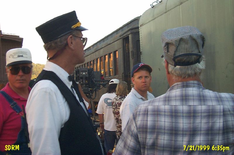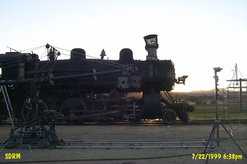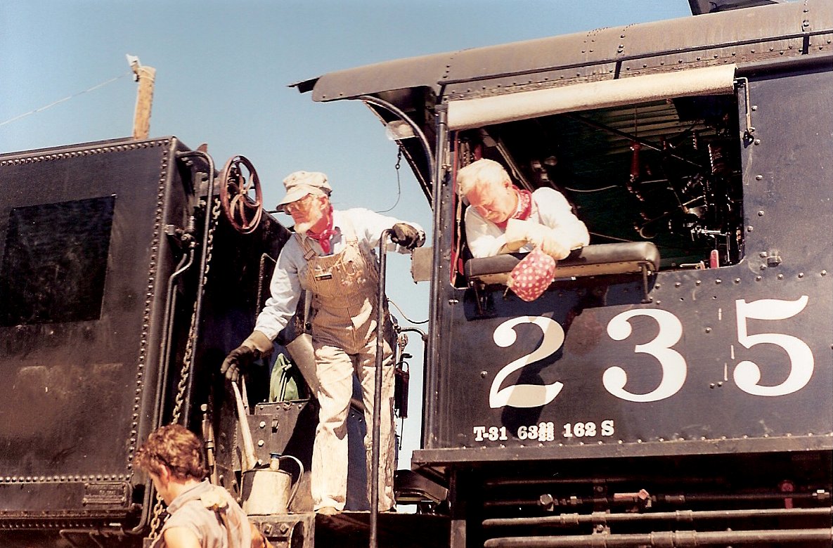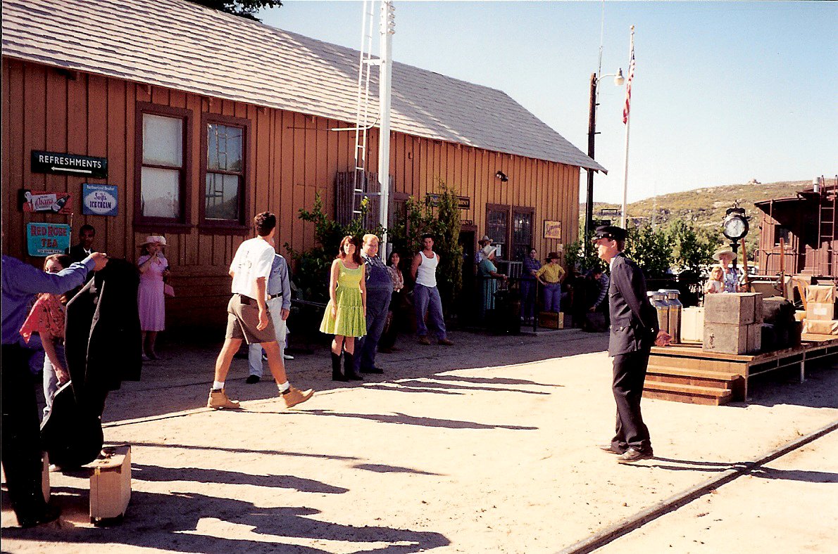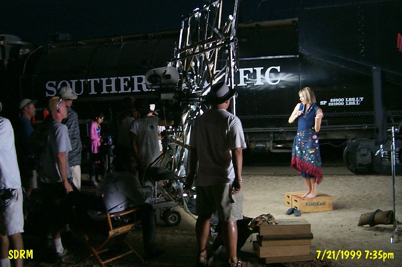 The video begins with #2353 pulling a long passenger train into the station with Denby Jones at the throttle and Ken Kahan as fireman. Conductor Jack O'Lexey waves a flag to stop the train and lots of extras are on hand as passengers. A small platform was built and placed in front of the baggage car as a location for one of the dance scenes. Jim Baker can be seen here carrying a parcel behind the dancers. Engineer Larry Williams was creating puffs of steam on demand by turning a valve in the cab.