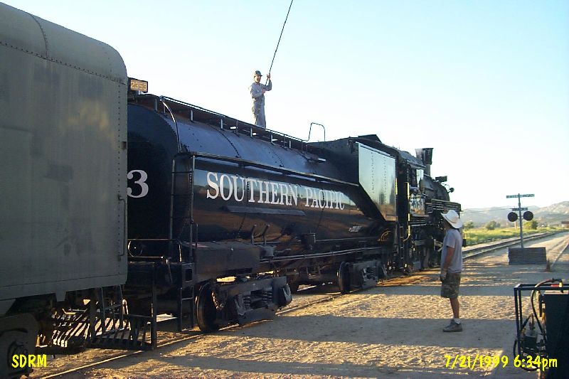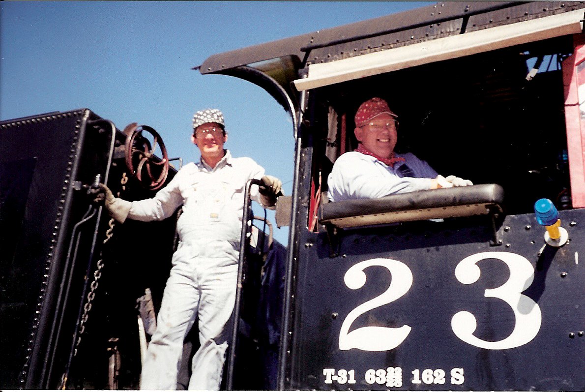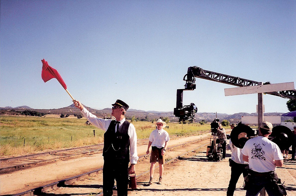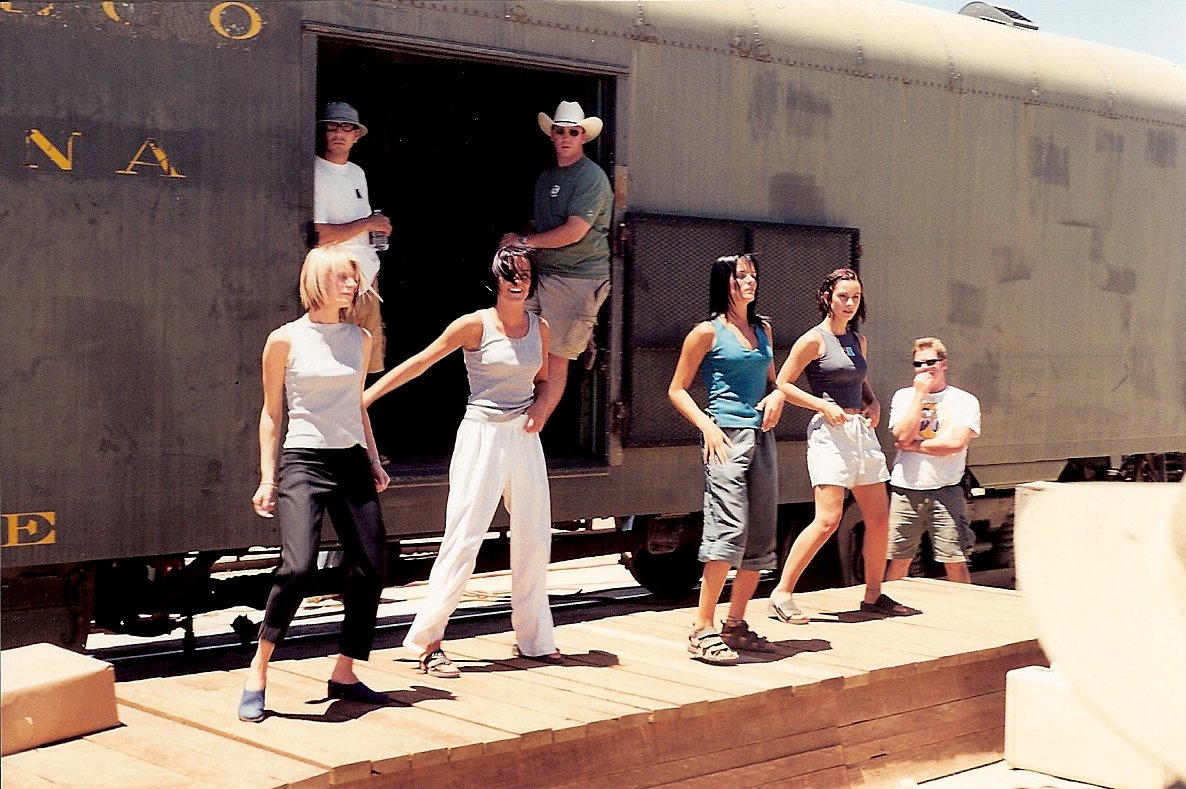 The video begins with #2353 pulling a long passenger train into the station with Denby Jones at the throttle and Ken Kahan as fireman. Conductor Jack O'Lexey waves a flag to stop the train and lots of extras are on hand as passengers. A small platform was built and placed in front of the baggage car as a location for one of the dance scenes. Jim Baker can be seen here carrying a parcel behind the dancers. Engineer Larry Williams was creating puffs of steam on demand by turning a valve in the cab.