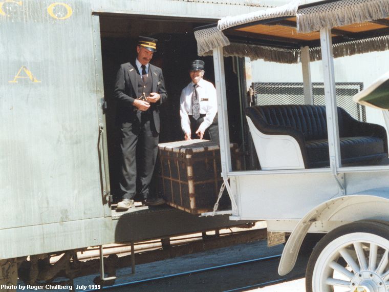 Left: Conductor Robin Becker and Trainman Beverly Hodges load the stage from the baggage car.
