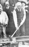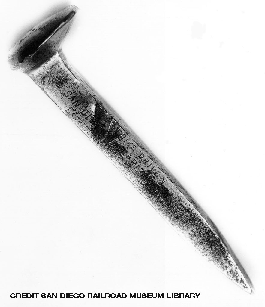 Then he jumped down, stripped off his coat and drove the final spike. It was a real gold one, costing $286, and it was inscribed "Spike driven, by John D. Spreckels, President." "Last spike driven, San Diego & Arizona Railway, in Carriso Gorge - November 15, 1919."
