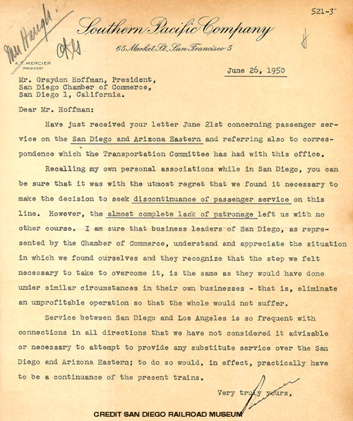 After passenger traffic had been discouraged almost to the vanishing point, the San Diego & Arizona Eastern Railway filed application with the California Public Utilities Commission on July 17th for authority to abandon its passenger service. Many protests were raised but to no avail. The Public Utilities Commission granted permission for the abandonment on December 19th. The last direct passenger train service to the east, for which the old timers had fought so tenaciously down through the years, left San Diego at 7:05 a.m. on January 11, 1951, with engine Southern Pacific number 2373 on the point. The final westbound train was pulled by engine number 2383, marking the end of an era. With it came the announcement that freight service will be converted to diesel power.