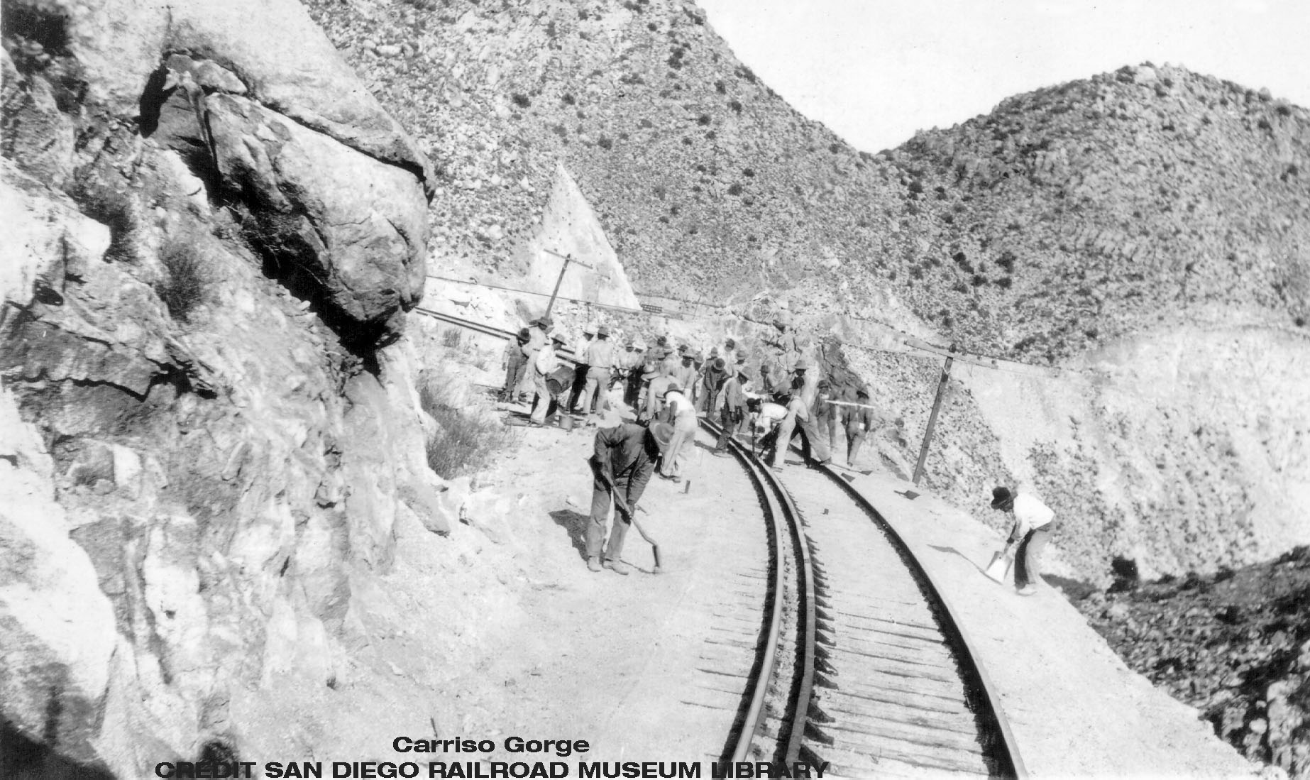 Then the final contract, covering the last twenty miles, was signed with the Utah Construction Company. This included the almost impossible stretch through Carriso Gorge. Work was started from both ends of the canyon. There were 17 tunnels to bore in the 11 miles in the Gorge proper, ranging from about 200 feet to 2,600 feet in lengths. The bench had to be carved out of the steep slopes of the canyon, sometimes as high as 900 feet above the bottom of the ravine. Wooden trestles were decided upon on account of the extreme heat during summer months. There were 14 side hill trestles, where the inside rail is on solid earth and the outer one is supported on the trestle. How this most difficult construction could be accomplished taxes one's imagination. Expensive by-pass roadways had to be constructed around the tunnel locations. Water for construction camps was a serious problem, as always in desert locations. 20 degree curves were required at several points. From the 2,835 feet elevation at Jacumba, the descending grade with a maximum of 2.2% brought the rail level to 2,006 feet at Carriso Gorge Station. The cost of the Gorge section exceeded the wildest estimates, resulting in an expenditure of over $4,000,000 and running the entire cost of the road up to $18,000,000.