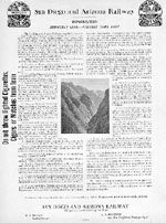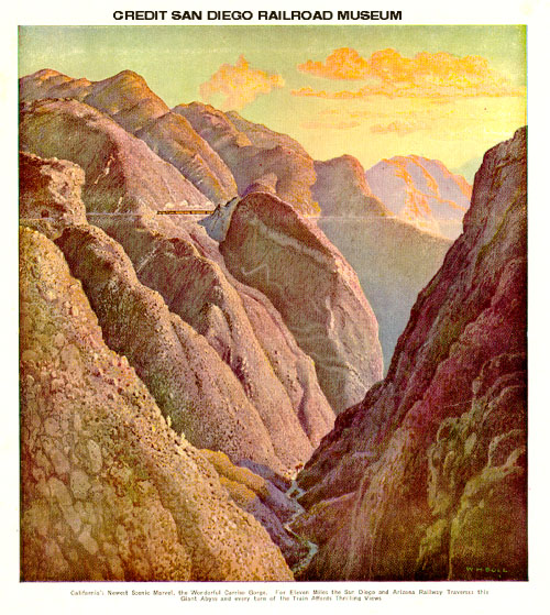 Nature never intended that a railroad should be built through magnificent Carriso Gorge. When surveys were being made for the San Diego and Arizona Railway, it was called the "impossible railroad" by several reputable engineers. But the S. D. & A. meandered the length of the Gorge by a tortuous route.Ever since the Mexican War, the hue and cry had been for a direct rail line to the east, first from military necessity, then to develop the Port of San Diego. Even when the California Southern Railroad, now Santa Fe, was built, 1881 to 1885, no direct line was achieved and when the Santa Fe management moved the offices to Los Angeles and the shops from National City to San Bernardino, making San Diego's bought and paid for railroad nothing but a branch line, promotions for a direct line again sprang up. None was brought into fruition. So, in 1906, there was no hope of ever financing a road, though some $40,000 had been raised for surveys and rights-of-way for a proposed route named San Diego & Eastern Railway.