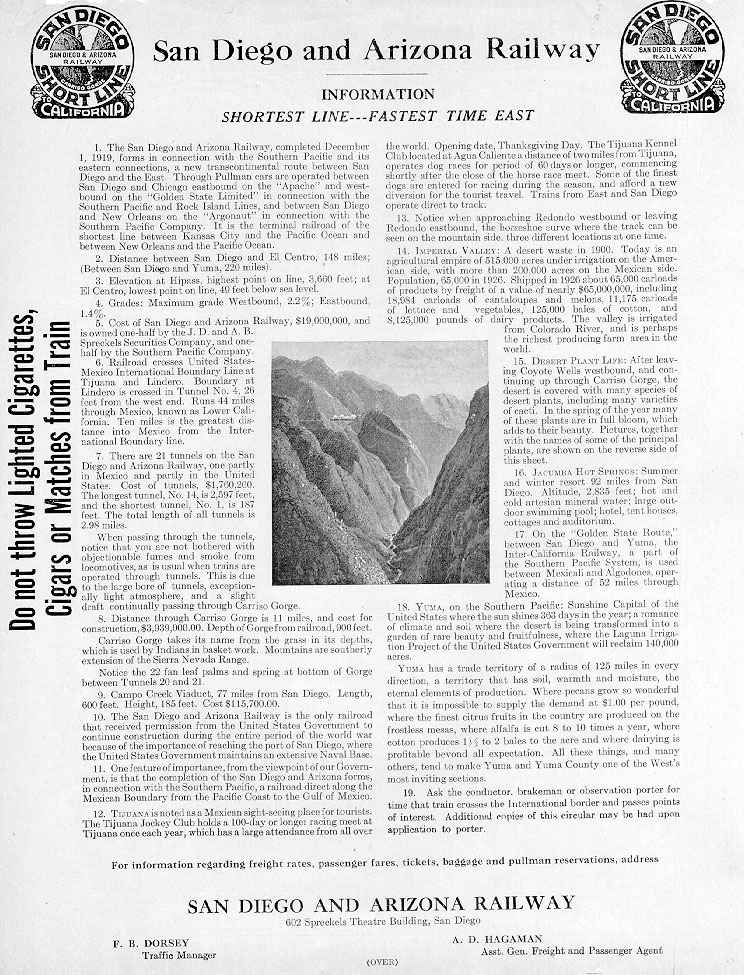 Private Car #050 had been assigned for the use of President Spreckels and had been named "Carriso Gorge." This car was used by A. T. Mercier, new President and General Manager, accompanied by A. D. Hagaman, General Freight and Passenger Agent, for a trip to New Orleans and the east in 1923. Motion pictures of San Diego, Coronado and the Gorge were shown in the car "to sell the San Diego & Arizona to railroad men." "Border Line Excursions" were operated in that year, fare $4.68 for the round trip.