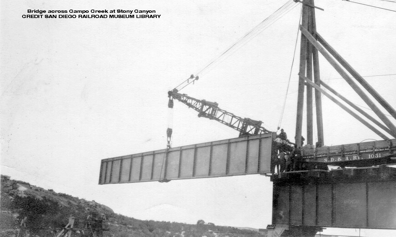 Twohy Bros. Company was awarded the contract for the construction of the roadbed from the terminal east of Campo for 20 miles, including the building of the spectacular bridge over Campo Creek at Stony Canyon. The highest point on the line is reached at Tecate Divide (Hipass) with an elevation of 3,660 feet, 82.4 miles from San Diego.
