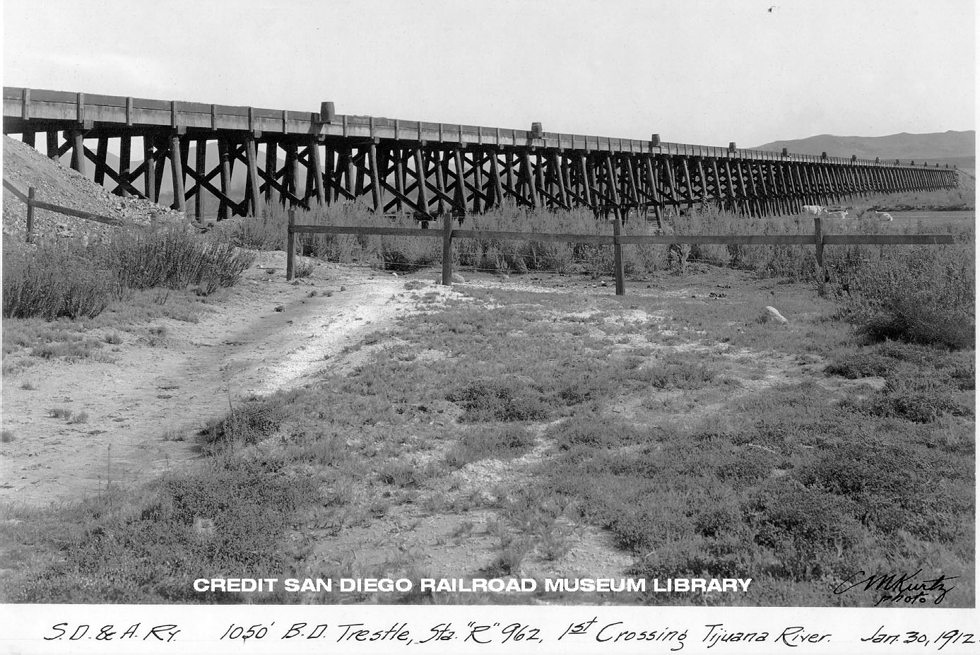 Rails were laid to the Mexican border in February 1910. The road's first passengers were carried into Mexico on a big excursion to Tijuana Hot Springs (Agua Caliente) on July 29. There a commemorative tablet was presented to John D. by a representative of the Chamber of Commerce. The bridge across the Tijuana River was completed by the end of the year.