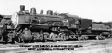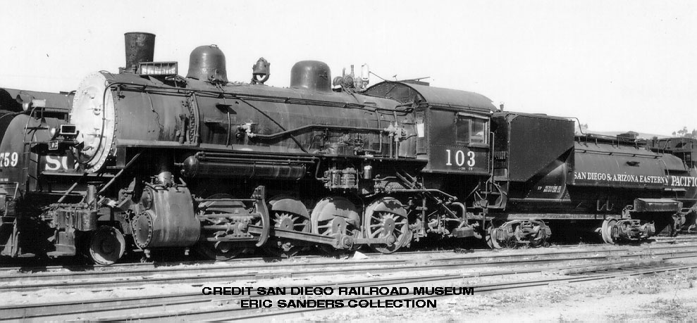 Ex Southern Pacific #2523. Acquired March 17, 1921. Returned to Southern Pacific May 1941 and renumbered 2523. Returned to SD&AE August 1948 renumbered 103. As built it had 43300 lbs tractive force, 200 lbs boiler pressure. Retired December 31, 1957.