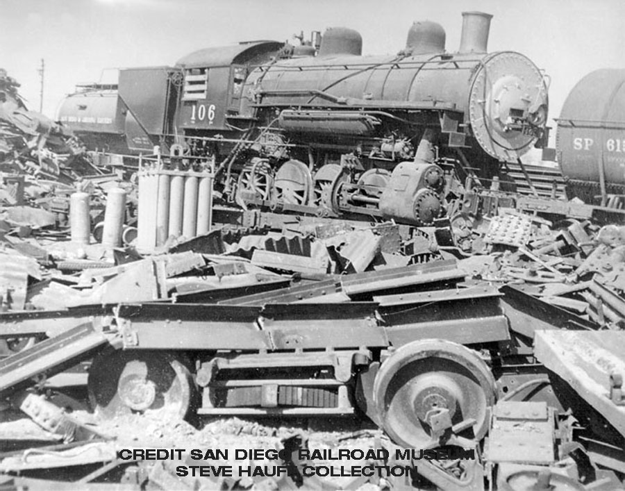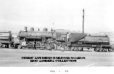Ex Southern Pacific #2844. Acquired March 12, 1931. Returned to Southern Pacific May 1941 and renumbered 2844. Returned to SD&AE August 1948 renumbered 106. As built it had 43300 lbs tractive force and 200 lbs boiler pressure. Sold to Purdy Co., Los Angeles for scrap October 7, 1958.