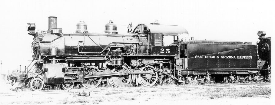 Built as Las Vegas & Tonopah Railroad #9. As built it had 57" drivers, 34200 lbs of tractive force. Acquired by S.D. & A. December 1919 and numbered #25. Scrapped August 1940.