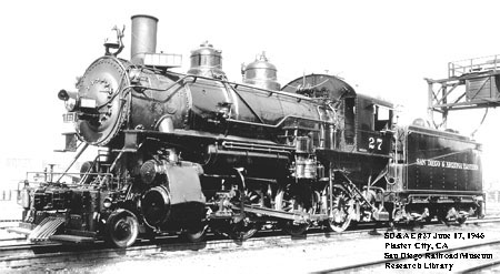 Built as Las Vegas & Tonopah Railroad #11. When this locomotive was built it had 57" drivers, and 34200 lbs. tractive force. Sold to S.D. & A. in December 1919 and numbered #27. Leased to S.P. Co. June 14, 1946. Returned to S.D. & A. E. May 23, 1947. Scrapped at S.P. shops in Los Angeles December 7, 1950.