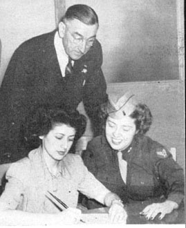 Helping her fill out her application is Vivian King, WAC recruiting officer, while Tom Fielding, SD&AE traffic manager, looks on.
