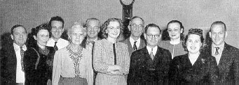 SERVICE BUREAU staff, left, includes, l to r: Robert Gremitt, Ruth Hall, Harry Schrader, Mildred Bushnell, Vito Siskos, Ruby Simponis, John Morell, F. W. Piepenbrink, chief.