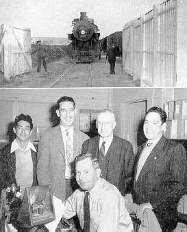 Stations' forces, left, include, l to r: Ralph Romero, C. L. Ley, William A. Finley, Juan Castlllo. Seated is W. A. Stewart. Finley is agent at San Ysidro and asst. general manager for lines in Mexico from Tijuana to Tecate. Castillo is agent at Tijuana.