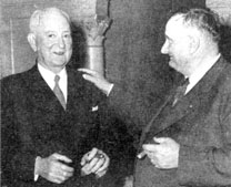 T. F. O'Connell (left), whose retirement May 1 as asst. master mechanic, SD&AE Ry., after nearly 49 years cf railroading, was announced in last month's Bulletin, is shown with his successor, F. W. Kubler, at surprise dinner given by 75 friends and associates.