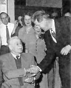 CHARLES A. BROWN receives congratulations of Supt. P. D. Robinson, LA Div., on retirement as head cost analyst after 45 years of railroading, last 34 with SP. Formerly he was with SD&AE and PE.