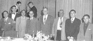 S. A. LAMEY, supt., SD&AE Ry., retired Jan. 31 after 51 years of railroading, 43 with SP and SD&AE. Above are representatives of Tijuana & Tecate RR who attended. Left to right: G. Castillo, agt.; C. L. Lay, VP&GM; J. Castillo, clerk; Lamey; J. B. Burdick, gen. mgr.; L. J. Espinosa, agt.; F. Cecesena, operator; S. Gomez, clerk. Other guests included J. W. Corbett, vice pres.; B. W. Mitchell, VP&GM, SD&AE, and supt., LA Div.; T. A. Purcell, asst. supt., LA Div.