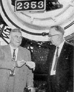 GIVEN AWAY last month was the "Grand Old Lady of Imperial Valley Railroading," locomotive 2353, when she was dedicated as a memorial at the California Mid-Winter Fair. Imperial Valley will keep her, and she will rest there where she worked so well. Leo Ford, right, our DF&PA at El Centro, presents a silver spike to J. R. Snyder, president of the fair board, in the ceremony.