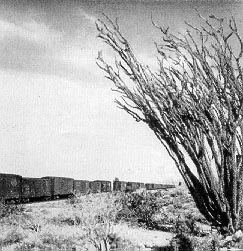 (Photo at left) At Dos Cabezas our train stops to pick up a car. The large ocotilla cactus is bright with red blooms.