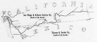 The San Diego & Arizona Eastern owns a subsidiary, the Tijuana & Tecate Railway, which has title to a 44.4-mile portion of track in Mexico. Combined, they give us an international route running from San Diego southward across the border into Baja California, and climbing back again through a wild world of rocks to Tierra Del Sol at 3,660 feet elevation, then through tunnels and over trestles clinging to the side of spectacular Carriso Gorge, and down through a gray desert into the green Imperial Valley, which is below sea level.