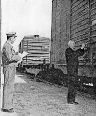 (Photo left)Customs Inspector J.T. Hicks, left, watches as B.D. Cornell, telegrapher-clerk, seals a car before it crosses the border into Mexico.
