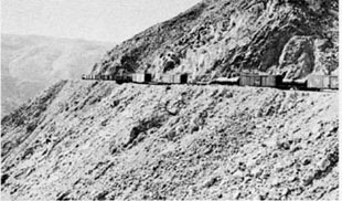 A freight train winds its way along a shelf among the barren rocks of Carriso Gorge on the San Diego & Arizona Eastern. Retiring Superintendent Carl Eichenlaub probably knows this rugged route better than anyone on the railroad.