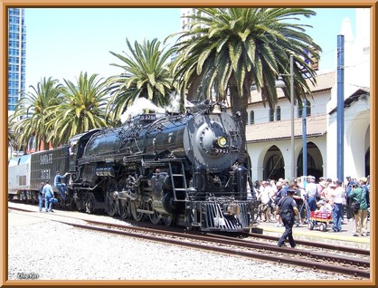 Locomotive 3751 steamed into San Diego on Sunday, June 1, 2008, its first visit since it hauled the last steam powered passenger train out of San Diego in 1953. Since then the old 1915 vintage San Diego station had not seen a steam powered train of any kind. The long dry spell ended with the triumphant return of the first 4-8-4 built for the Santa Fe in 1926 as the first "Northern" class engine on the railroad. This was big news and made prime time on all local TV networks. The 300-ton super machine was splendid and made thousands of new fans who were exposed to the magic of big time steam for the first time.