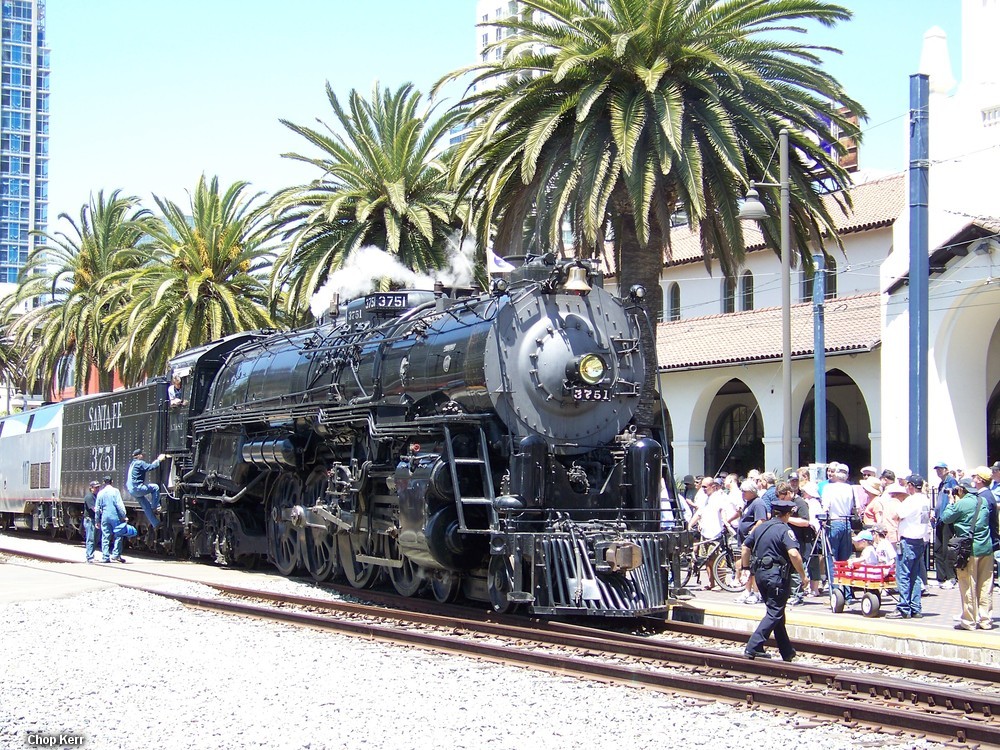 Santa Fe #3751 Visits San Diego As the iron monster roared into town, in the cab window was Amtrak honcho Ron Hyatt. Yes, THAT Ron Hyatt, PSRM's mechanical department chief! Next to him was Bob Kittel as 3751 doesn't go anywhere without him! On the ground chasing was nearly every serious rail fan in Southern California and just about every PSRMA member who had kept their ears to the rail listening for this special run. Many more PSRM types bought a ticket to ride the sold out special excursion.