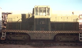 This four-axle diesel-electric Railroad switcher was built to Spec. RY24147, Phase Ic. Builder's #15118, it has a designated weight of 88,000 lbs. (44 tons), although like most 44-tonners it probably has heavier deck plates and may weigh out at 45 tons or more. It is 33' 5" long, 9' 6" wide, 13' 3" high; has 33" wheels in a B-B arrangement; a centercab; and side radiator shutters. It's powered by two Caterpillar D17000 V8 diesel engines, each with eight 5 3/4" x 8" cylinders and 190 hp at 1,000 rpm, totaling 380 hp. It has GE733 traction motors on all four axles; two GT555Al generators; 11.25:1 two-step gear ratio; 35 mph top speed; a 250-gallon fuel tank; and orange hood flashers.