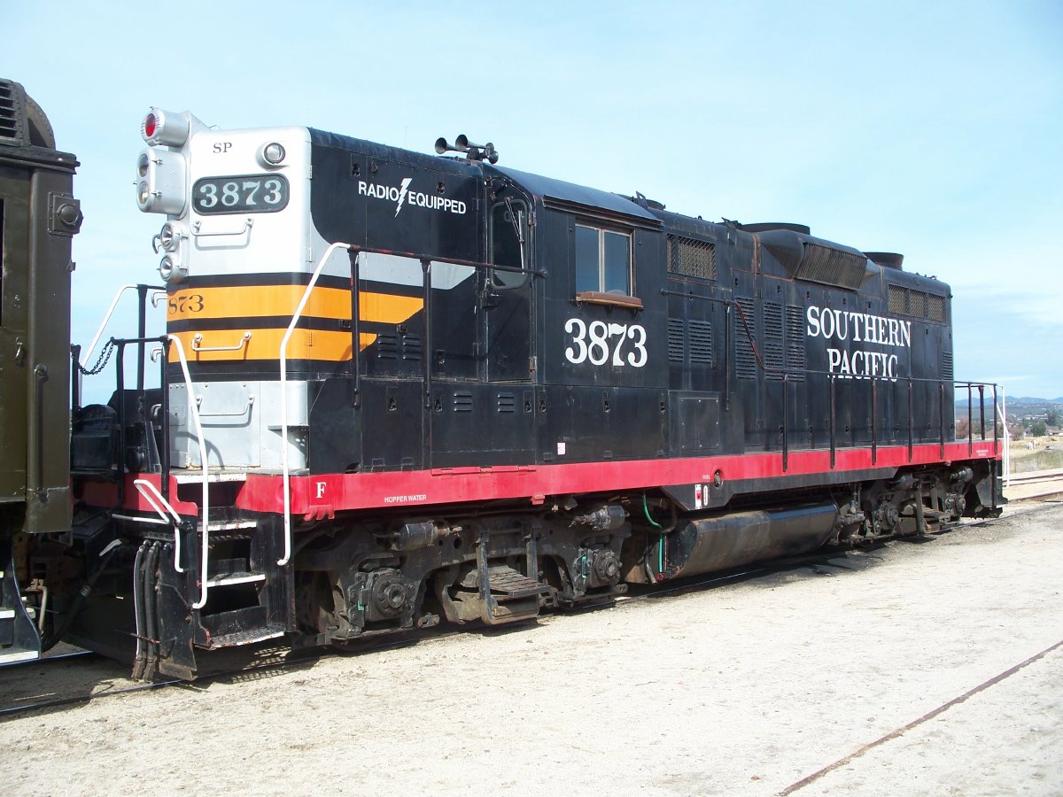 SSW #3873 was acquired for use on the SDRM's SD&A demonstration railway, so has been painted in the 1950s SP "Black Widow" scheme (which it never wore) to match the museum's MRS-1 SD&A #1809, with which it can MU-operate. It was lettered Southern Pacific #3873 in accordance with terms of the donation, also appropriate due to the history of SP GP9s on the SD&AE during its long SP ownership. SP #3873 was transferred to the SDRM June 25,1997, taken to Campo by the SD&IV, and has begun a new career pulling passenger trains!