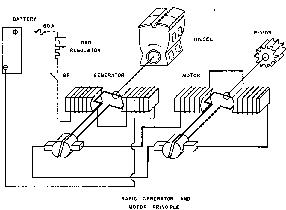 7. The traction motors divide this power equally; if there are four motors attached to a generator, each motor gets one quarter of the power coming from the generator.