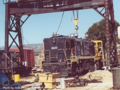 For many years this giant gantry crane was used by the Santa Fe at the south end of its team tracks south of the Santa Fe Depot in San Diego, near the intersection of Market and California Streets (the latter a dirt street along the Santa Fe tracks in downtown San Diego). In early 1984, the redevelopment of the Santa Fe's property in the area made much equipment surplus. The rolling gantry crane, related equipment including the wooden trolley poles, three switches, two sheds, a motor generator, and a half-mile of rail in the downtown area were all donated to the PSRMA in March 1984 by the Santa Fe, after requests by PSRMA Executive Director Jim Lundquist.