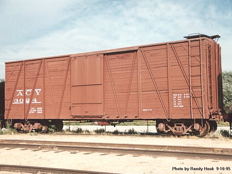 This boxcar from the ACY 3001-3149 series (the largest ones built by Mather) has Mather Company S-705 four-wheel trucks, National Flexo bearings, a steel underframe, metal-covered roof, and single-sheathed wood ends supported by four steel Z-braces. Its single- sheathed wood sides have an outside-braced truss of vertical Z-braces, and outward-facing channels for diagonals. Its top-hung wooden doors are 6'0" wide and 9'7" high. The car is 41'0" long, 10'0" wide, and 14'9" high. Its interior is 40'6" long, 9'2" wide, and 10'3" high. It weighs 49,600 lbs.(24.8 tons) and has a 92,000 lb.(46 ton) capacity in its 3,805 cubic feet of cargo space.