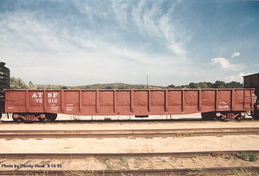 This Class Ga-108 steel, four-axle, solid bottom, fixed end, mill gondola was part of the 750-car 72250-72999 series. Its ends were welded in place, the floor is of 3/8" steel plate, and it has ASF trucks. ATSF #72312 is 52' 6" long over end sills; 56' 5" long over pulling face of couplers; 10' 3 1/8" wide over side (bulb) angles; and 7' 11/16" high. Its interior is 52' 6" long; 9' 6" wide, and 3' 6" high. Originally weighing 56,000 lbs. (28 tons), this car now weighs 53,700 lbs. (26.85 tons); has a 154,000 lb. (77 ton) capacity (originally 140,000 lbs.) and a 166,300 lb. (83.15 tons) load limit (originally 154,000 lbs.) in its 1,745 cubic feet of cargo space.